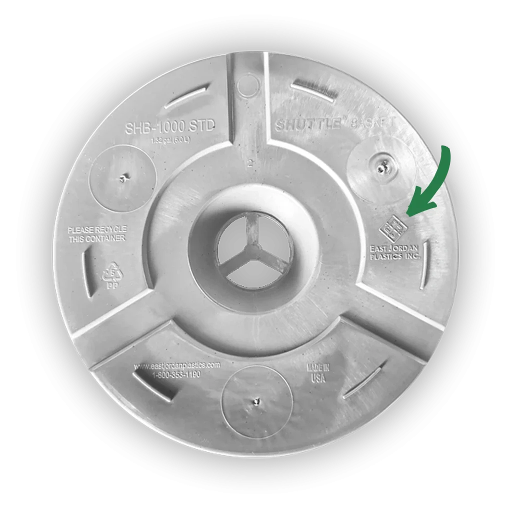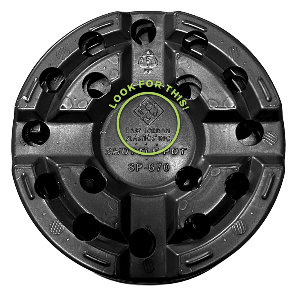 Look for plants sold in East Jordan Plastics containers, which feature this symbol on the bottom: ![]()